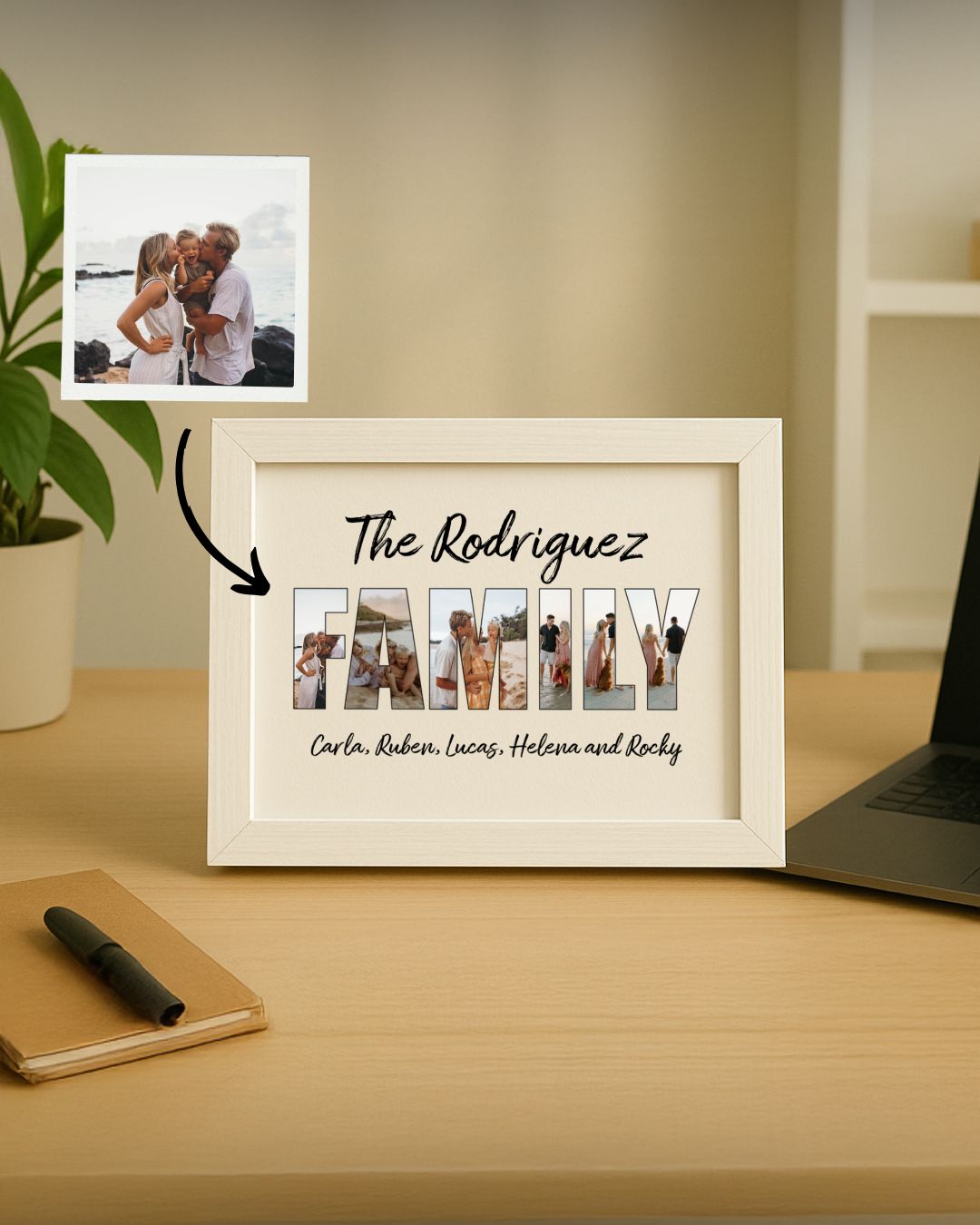 The gift that lasts forever. Includes a physical frame (Beige, Black or White) in MDF with protective glass, available in two sizes and ready to hang. Created from your photos and dedications, we print on premium paper and add the text and details you want. It is more than a frame — it is a piece of your story to decorate or give.