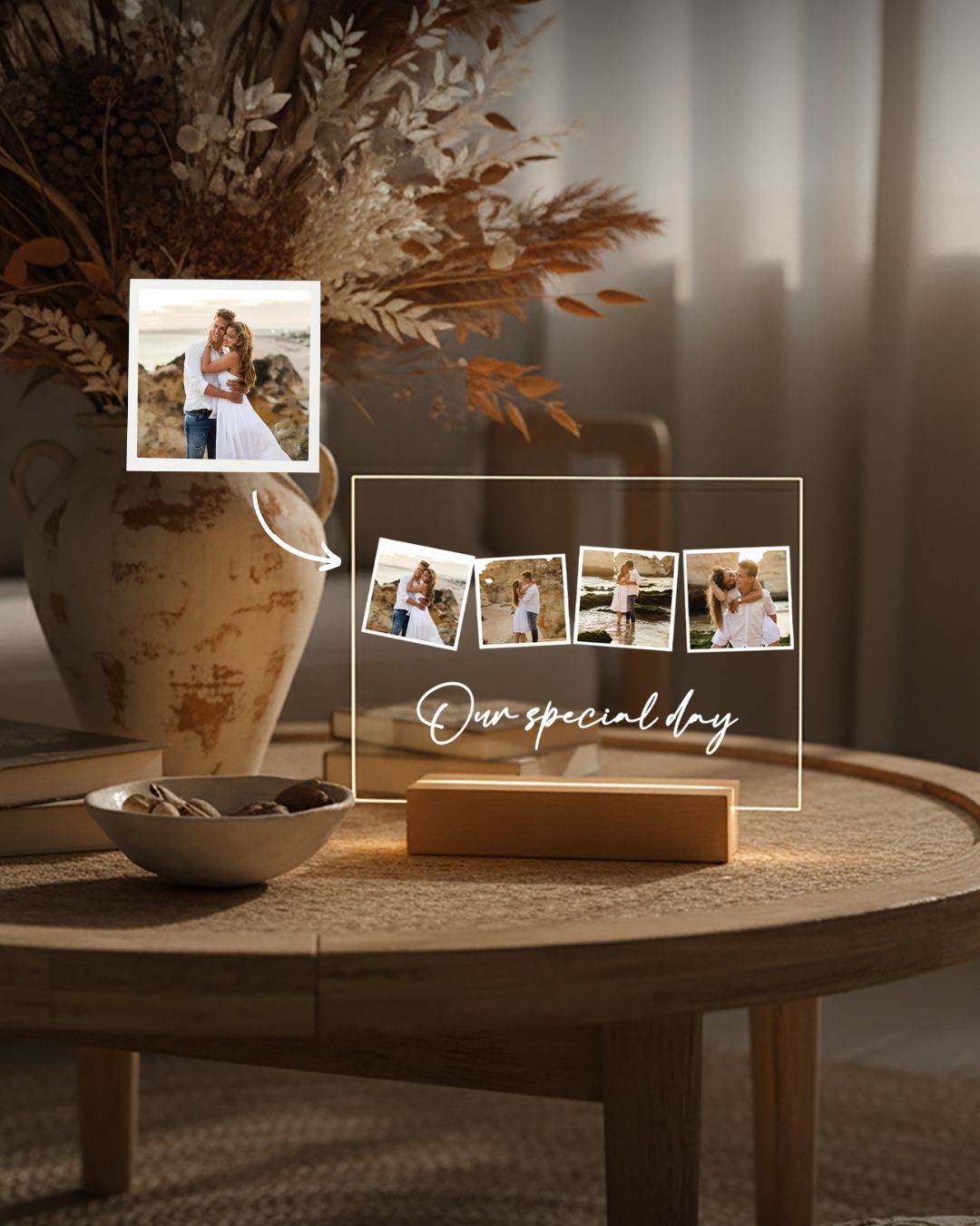 Ilumina recuerdos. Producidas en acrílico cristal de alta resistencia, con impresión directa para detalles perfectos, nuestras lámparas transforman fotos, frases e ilustraciones en luz y arte. La base con alimentación USB ofrece un brillo suave que da vida a cualquier espacio. Más que decoración, es una forma de eternizar momentos y ofrecer regalos con emoción.