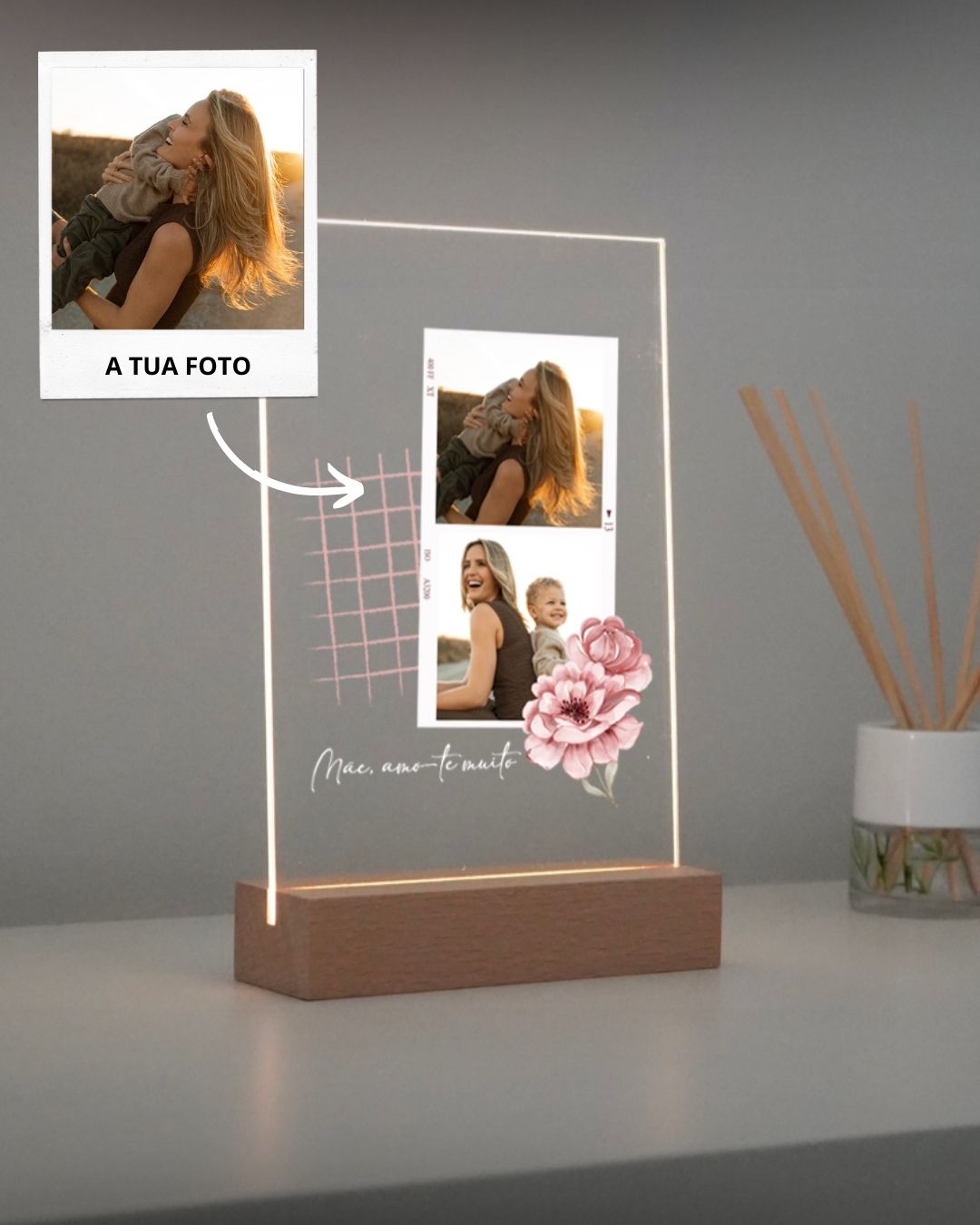 Ilumina recuerdos. Producidas en acrílico cristal de alta resistencia, con impresión directa para detalles perfectos, nuestras lámparas transforman fotos, frases e ilustraciones en luz y arte. La base con alimentación USB ofrece un brillo suave que da vida a cualquier espacio. Más que decoración, es una forma de eternizar momentos y ofrecer regalos con emoción.