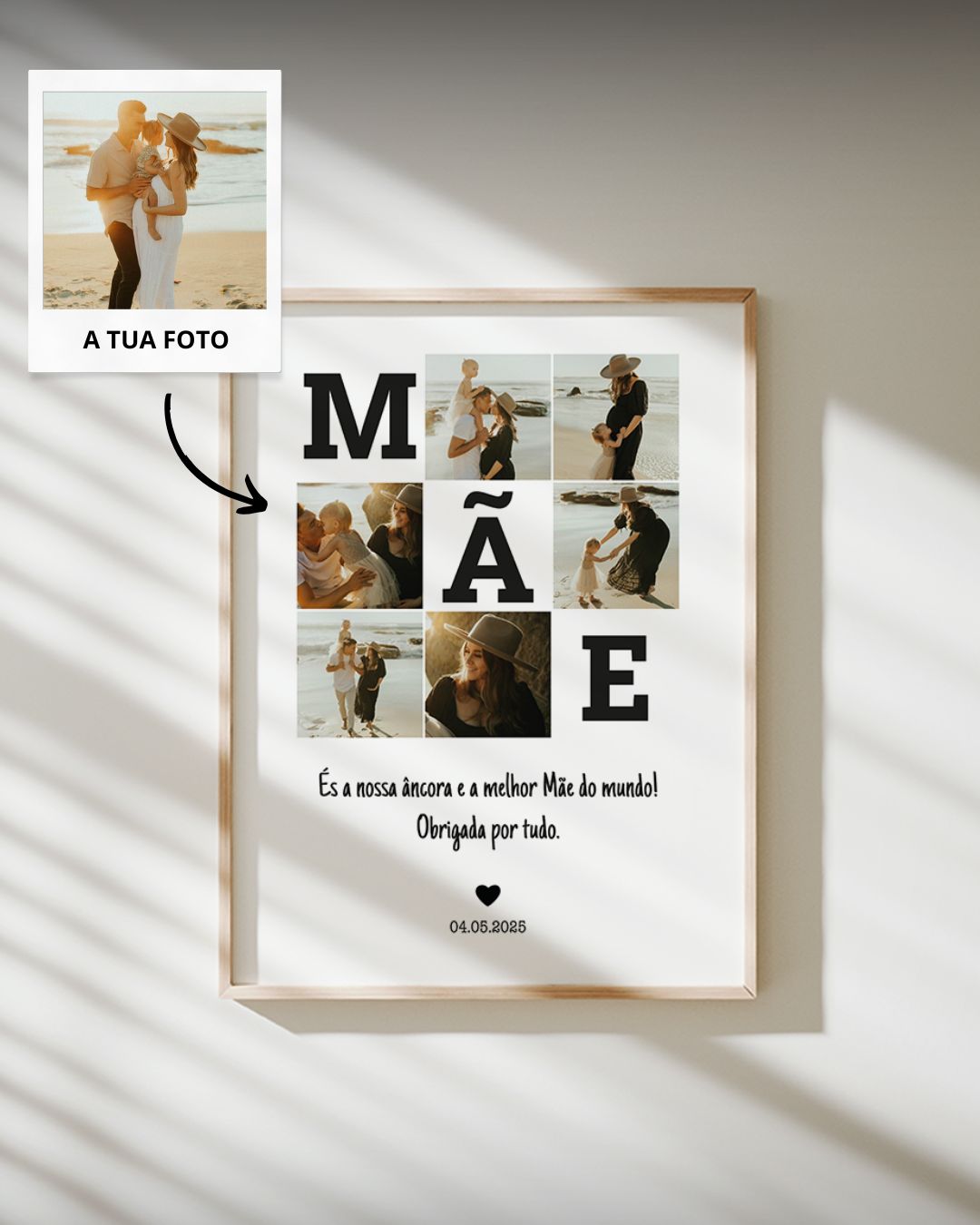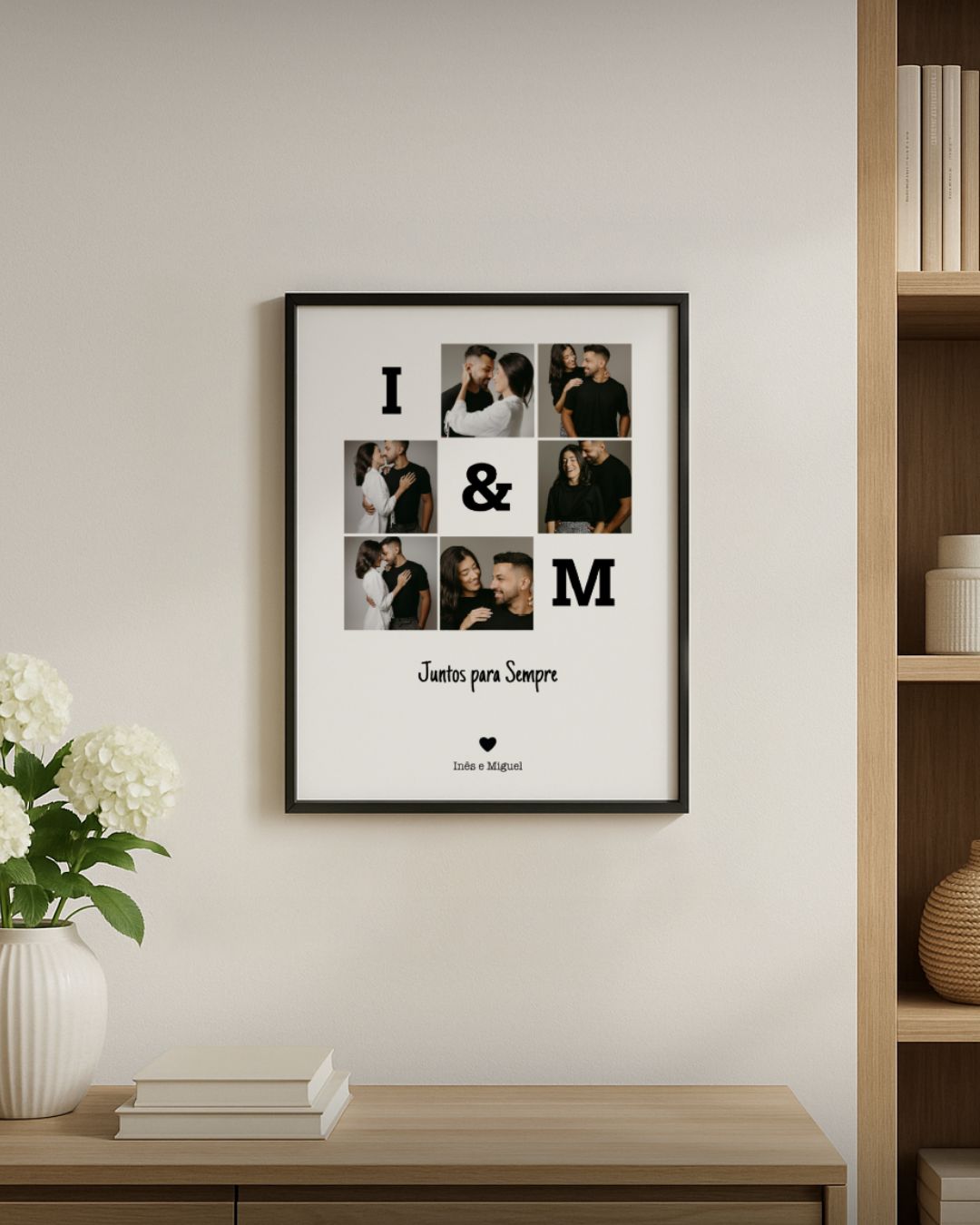 El regalo que queda para siempre. Incluye marco físico (Beige, Negro o Blanco) en MDF con vidrio protector, disponible en dos tamaños y listo para colgar. Creado a partir de tus fotos y dedicatorias, imprimimos en papel premium y añadimos el texto y los detalles que desees. Es más que un cuadro — es un pedazo de tu historia para decorar o regalar.