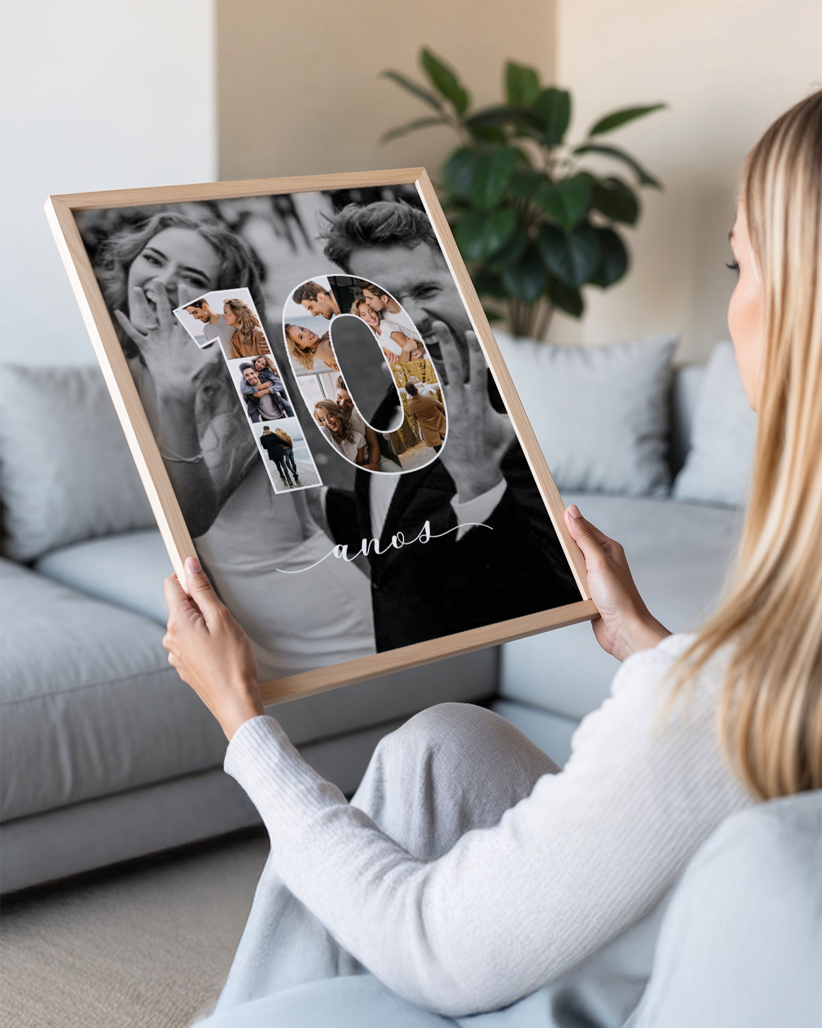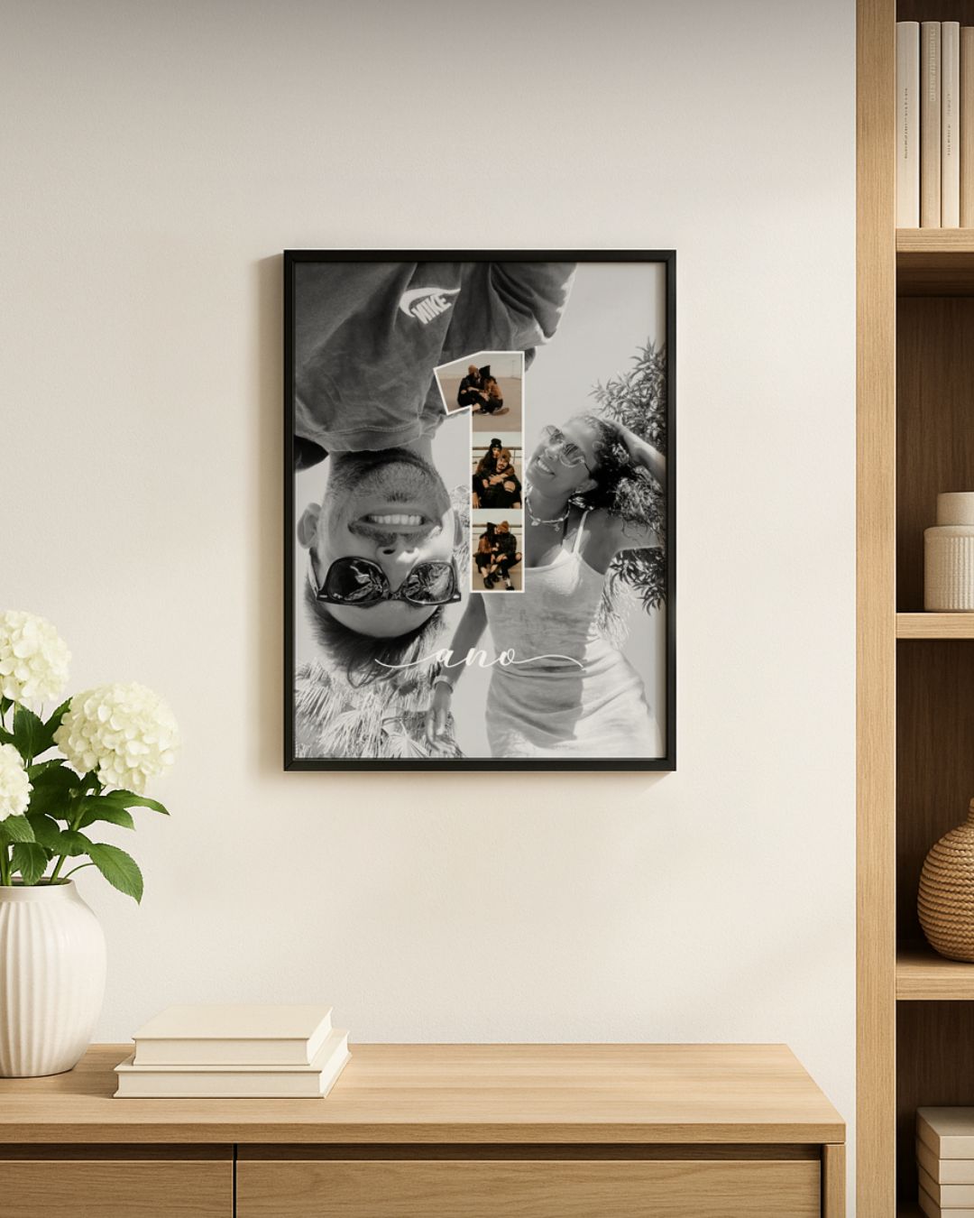 El regalo que queda para siempre. Incluye marco físico (Beige, Negro o Blanco) en MDF con vidrio protector, disponible en dos tamaños y listo para colgar. Creado a partir de tus fotos y dedicatorias, imprimimos en papel premium y añadimos el texto y los detalles que desees. Es más que un cuadro — es un pedazo de tu historia para decorar o regalar.