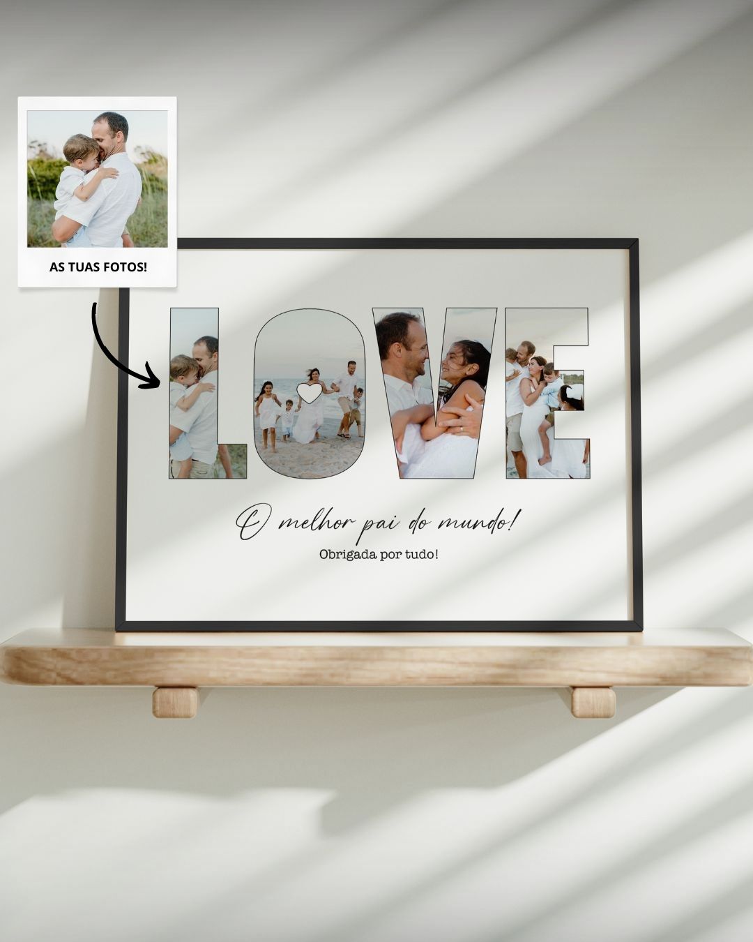 El regalo que queda para siempre. Incluye marco físico (Beige, Negro o Blanco) en MDF con vidrio protector, disponible en dos tamaños y listo para colgar. Creado a partir de tus fotos y dedicatorias, imprimimos en papel premium y añadimos el texto y los detalles que desees. Es más que un cuadro — es un pedazo de tu historia para decorar o regalar.