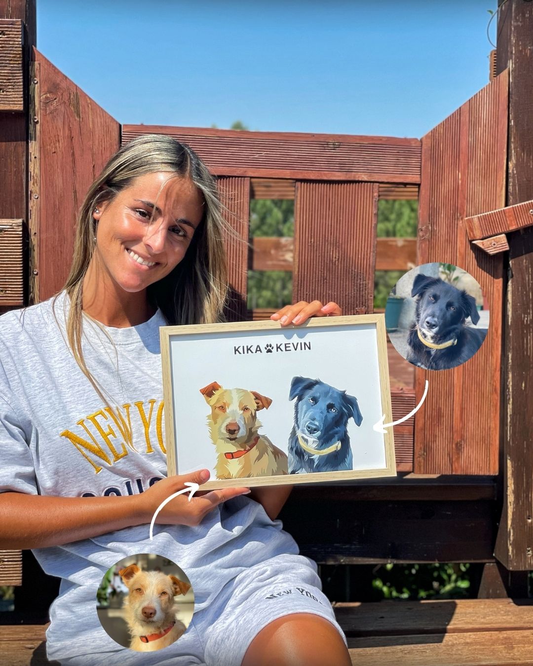 ¡Sí! Ya sea una camiseta o un cuadro, puedes poner el nombre de tu mascota para que esté junto a tu retrato.