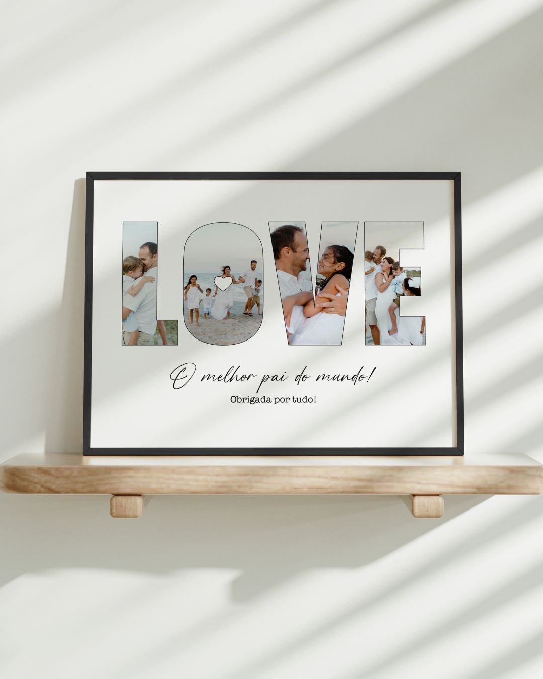 Material: O presente que fica para sempre. Inclui moldura física (Bege, Preto ou Branco) em MDF com vidro protetor, disponível em dois tamanhos e pronta a pendurar. Criamos a ilustração a partir das tuas fotos, imprimimos em papel premium e acrescentamos o texto e os detalhes que personalizares. É mais do que um quadro — é um pedaço da tua história para decorar ou oferecer.