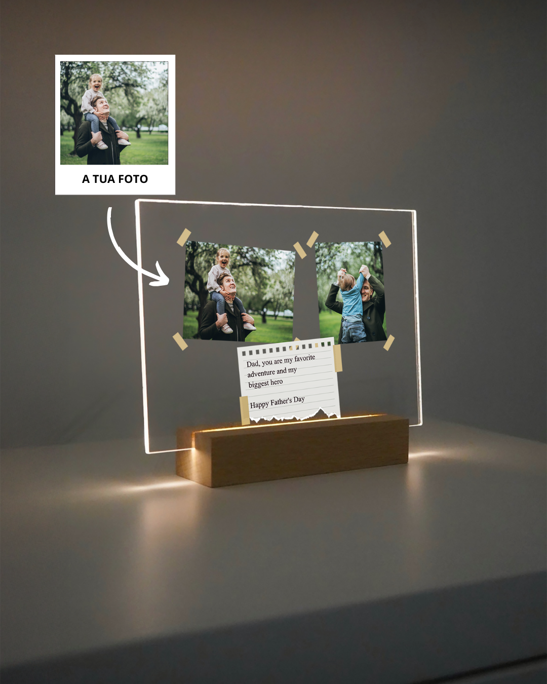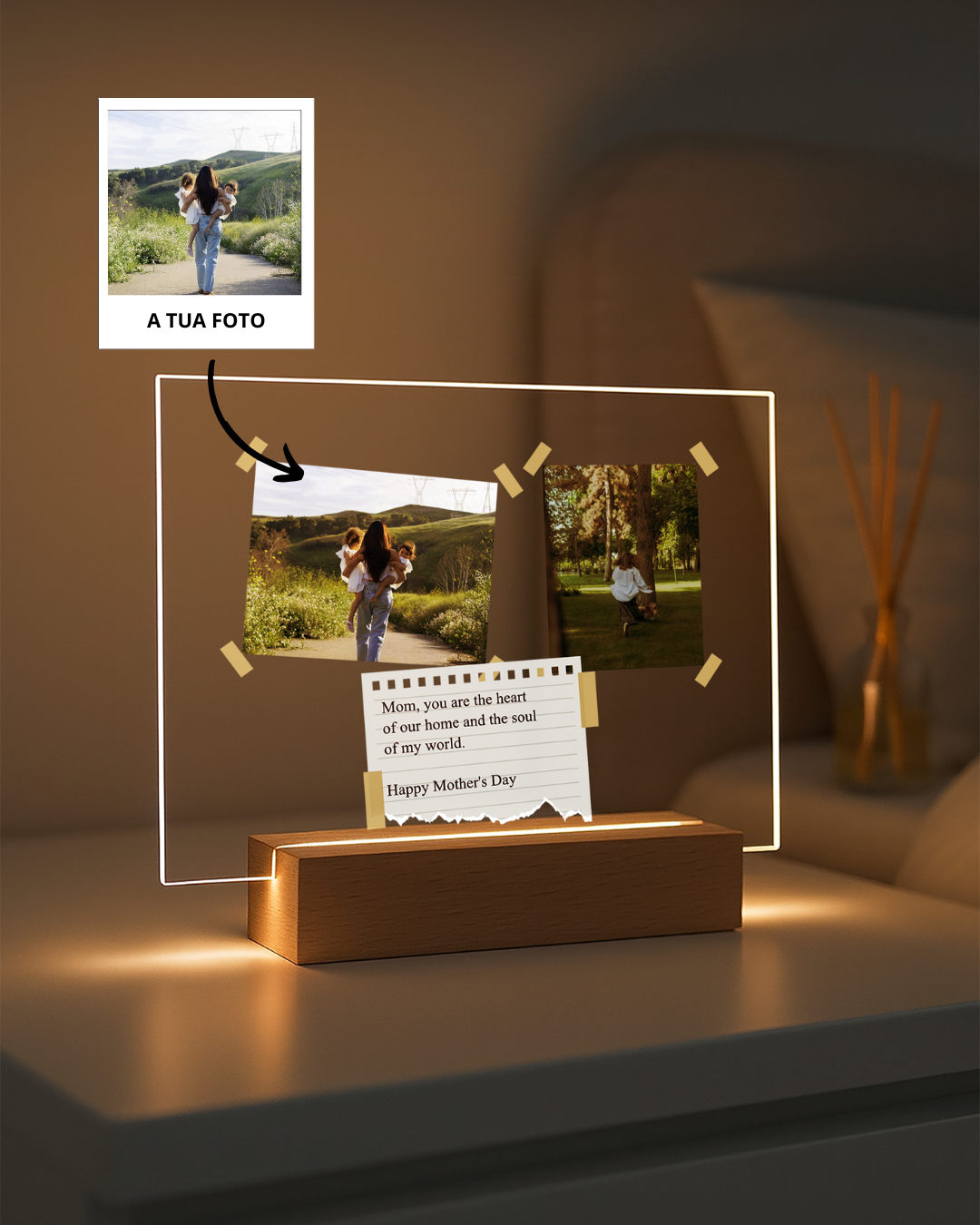 Material: Produzidas em acrílico cristal de alta resistência, com impressão direta para detalhes perfeitos, as nossas placas transformam fotos, frases e ilustrações em luz e arte. A base com alimentação USB oferece um brilho suave que dá vida a qualquer espaço. Mais do que decoração, é uma forma de eternizar momentos e oferecer presentes com emoção.