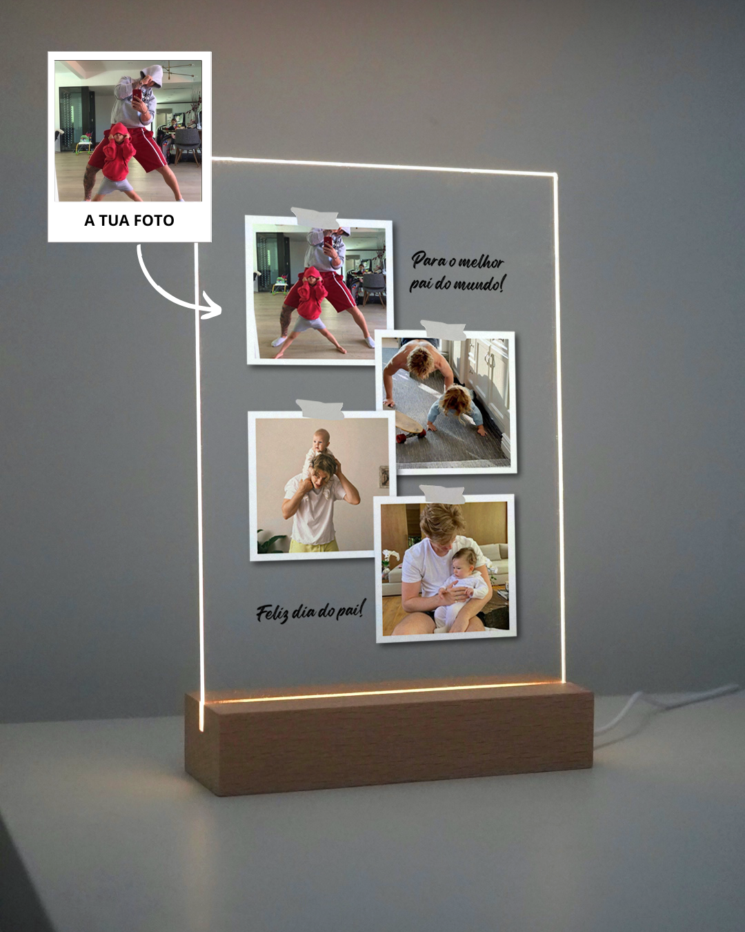 Material: Produzidas em acrílico cristal de alta resistência, com impressão direta para detalhes perfeitos, as nossas placas transformam fotos, frases e ilustrações em luz e arte. A base com alimentação USB oferece um brilho suave que dá vida a qualquer espaço. Mais do que decoração, é uma forma de eternizar momentos e oferecer presentes com emoção.