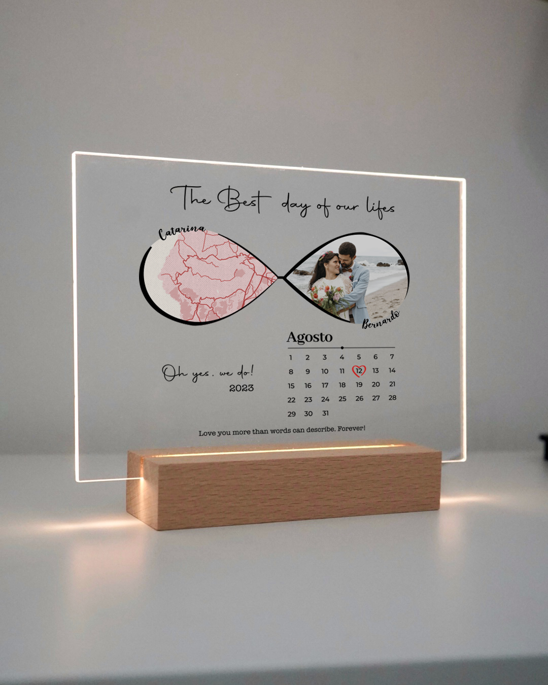 Material: Produzidas em acrílico cristal de alta resistência, com impressão direta para detalhes perfeitos, as nossas placas transformam fotos, frases e ilustrações em luz e arte. A base com alimentação USB oferece um brilho suave que dá vida a qualquer espaço. Mais do que decoração, é uma forma de eternizar momentos e oferecer presentes com emoção.
