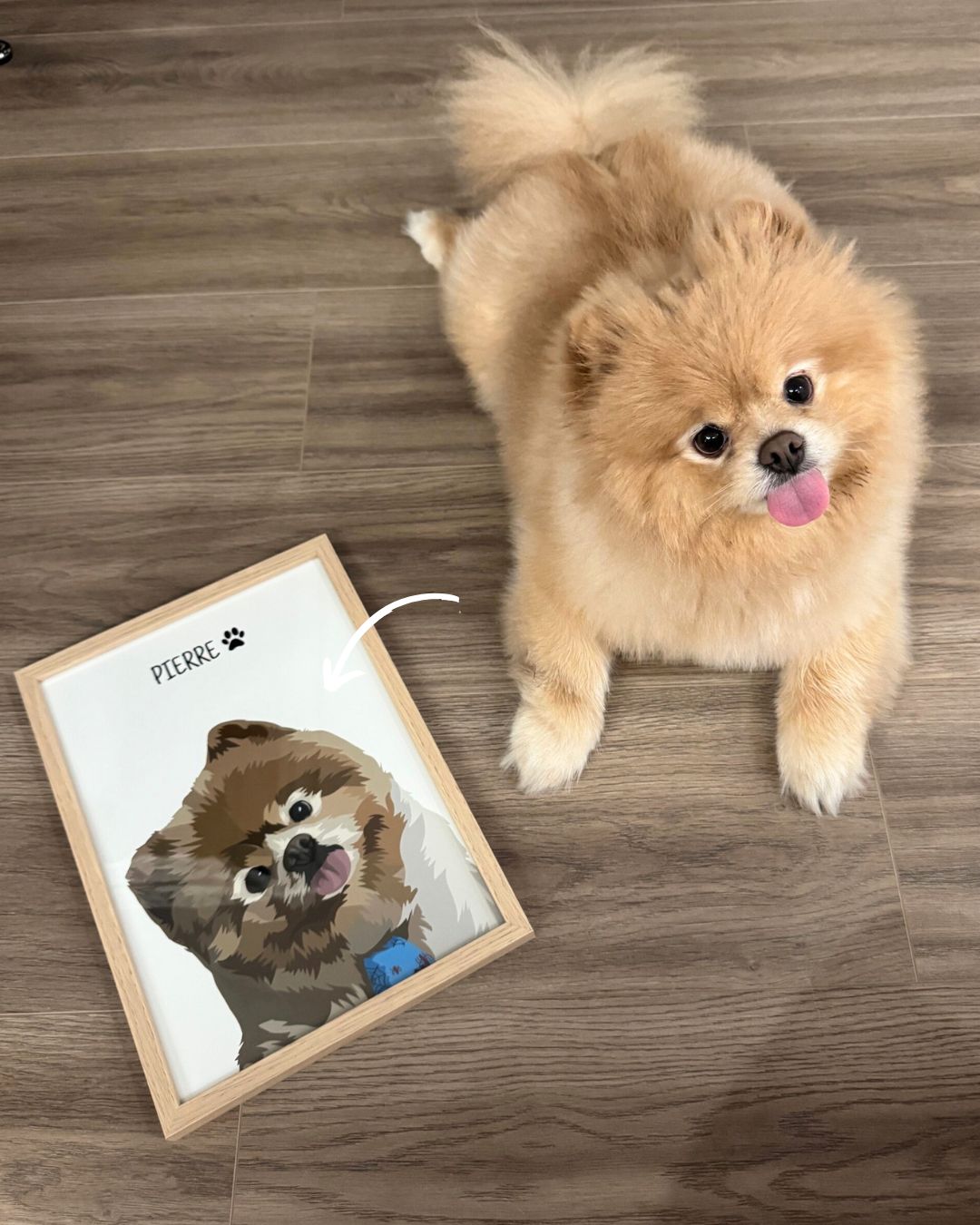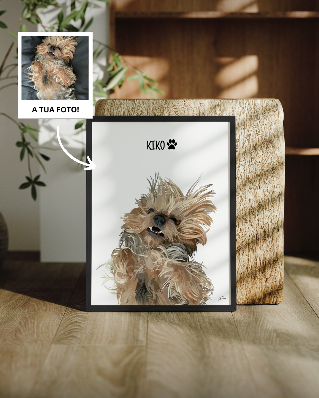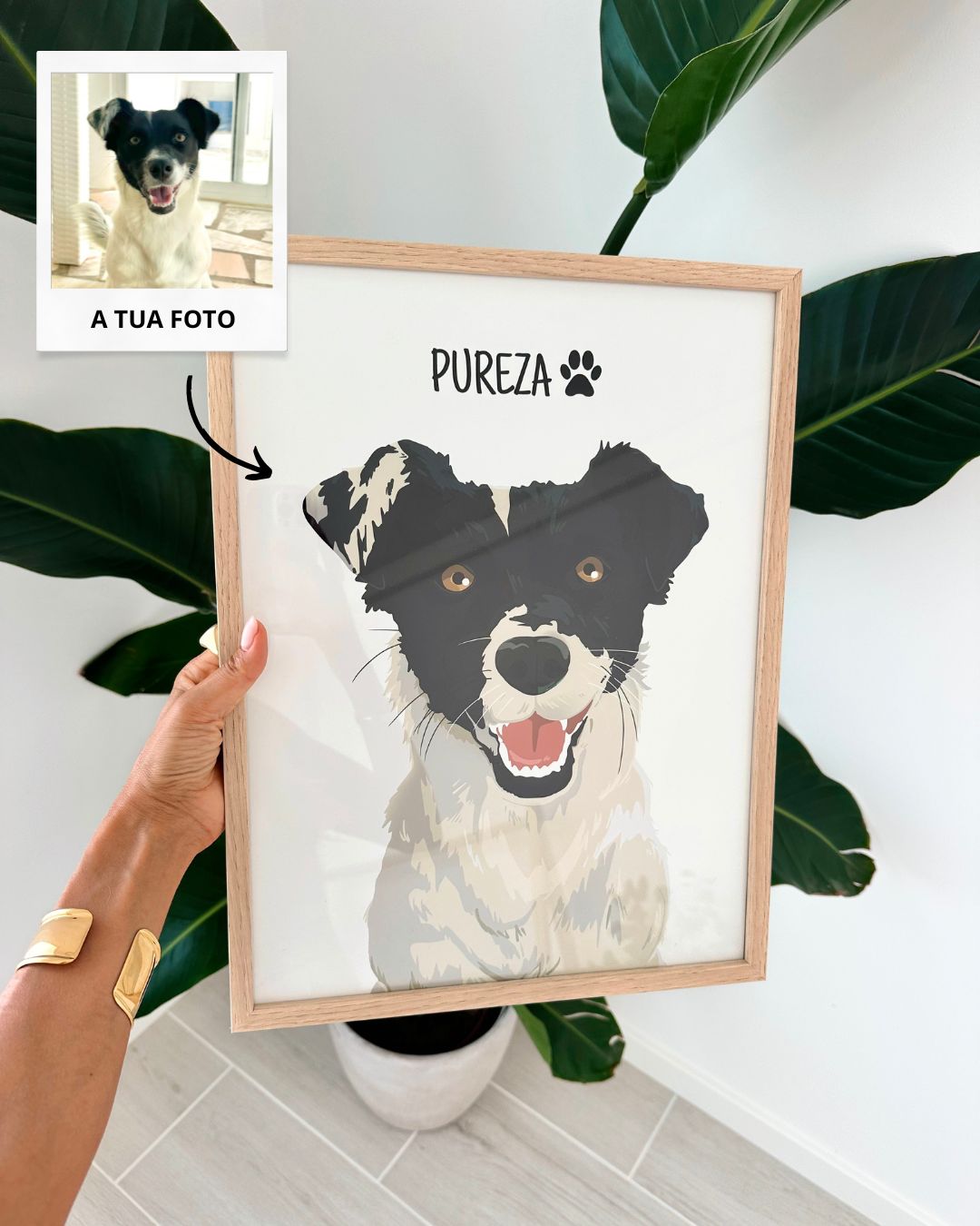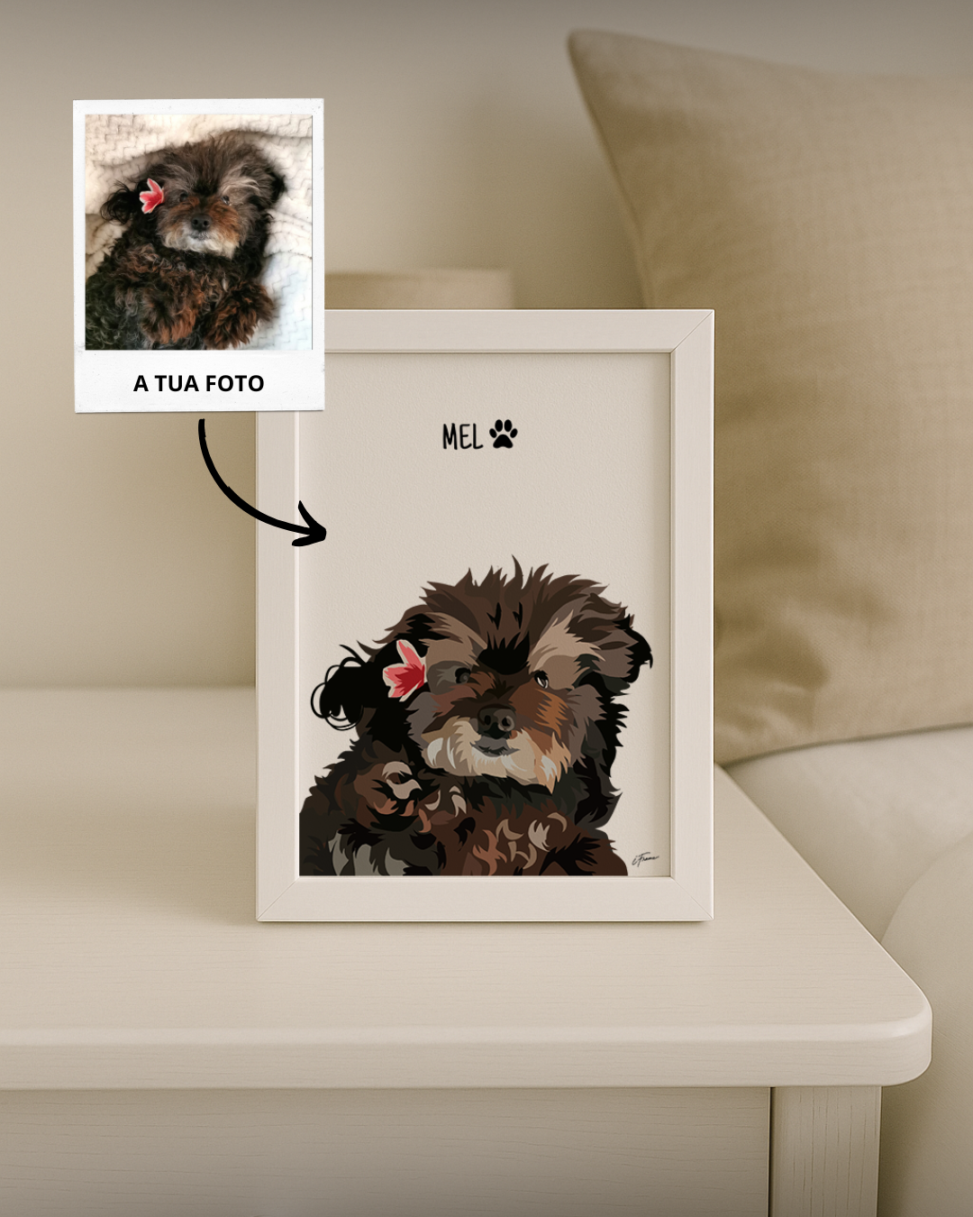 Material: Transforma o teu animal num verdadeiro protagonista. Inclui moldura física (Bege, Preto ou Branco) em MDF com vidro protetor, disponível em três tamanhos (13x18cm, 21x30cm e 30x40cm) e pronta para pendurar. Criamos uma ilustração única a partir da foto do teu pet, impressa em papel premium para cores vivas e duradouras, com possibilidade de acrescentar o nome ou uma frase especial. Produzido localmente e pronto a pendurar, é mais do que um quadro: é uma homenagem ao teu companheiro de quatro patas.